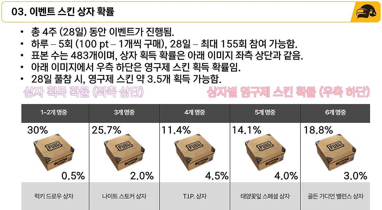 - 이벤트 스킨 상자 획득 확률이 공지된 바가 없어서, 지인분들의 도움을 받아 표본 수 총 483개에서 이벤트 상자 획득 개수를 기록한 결과....
