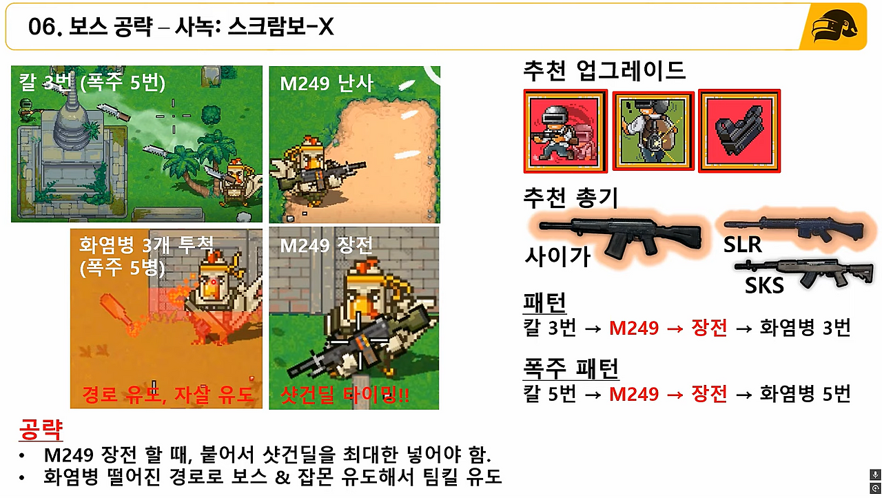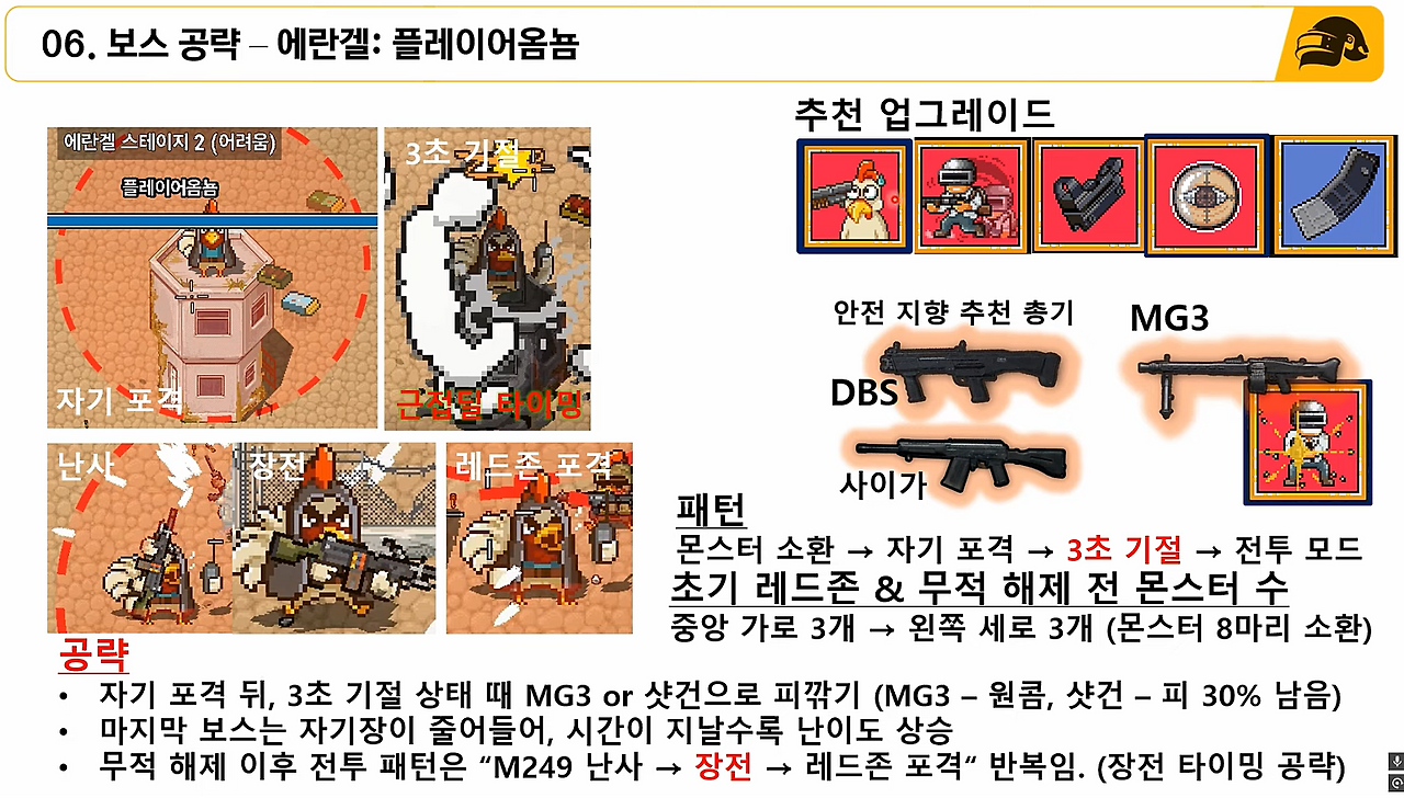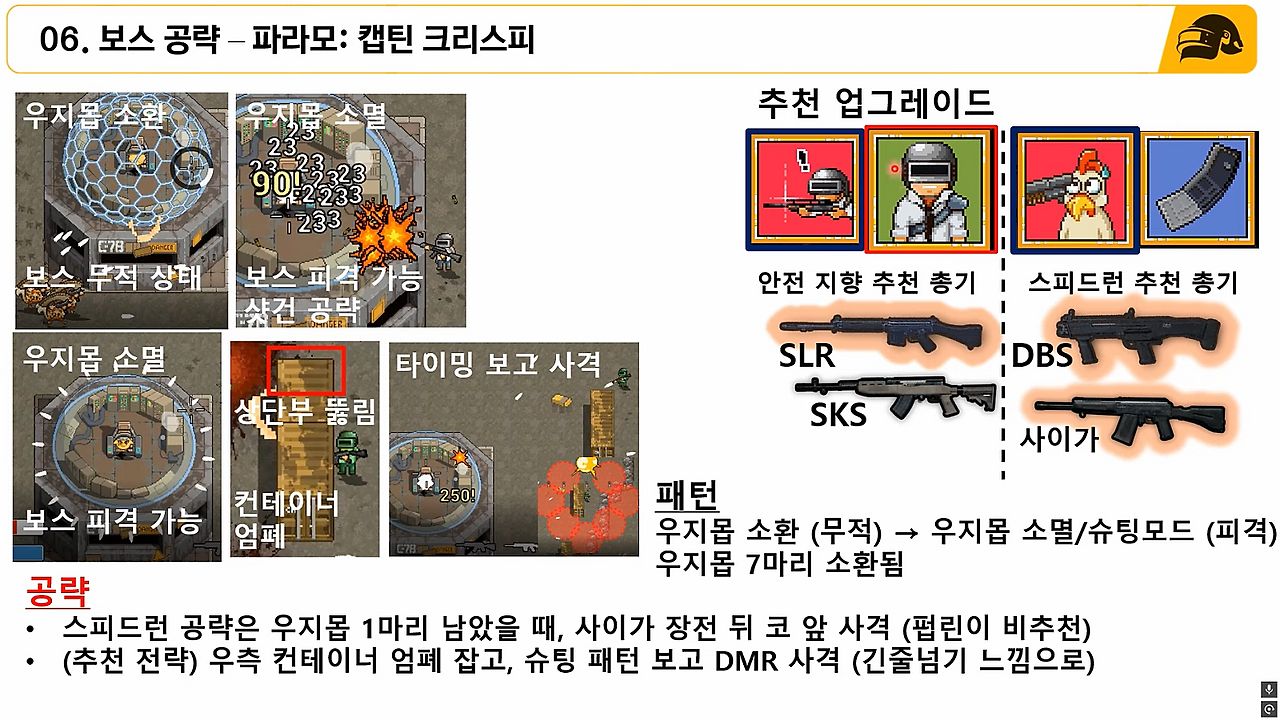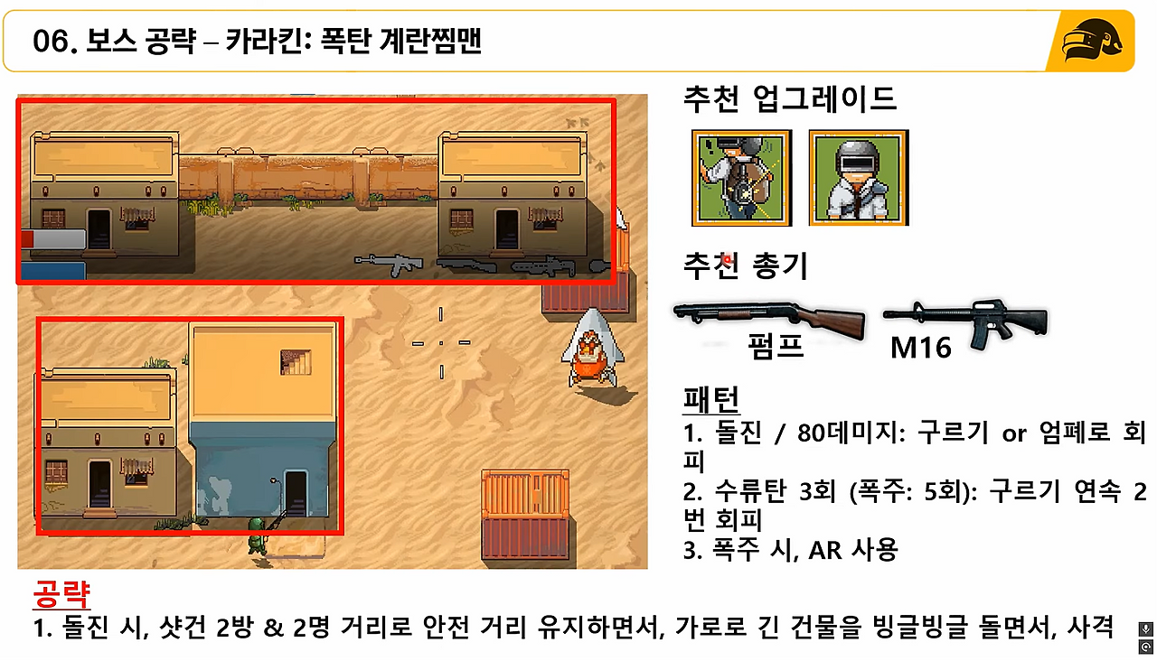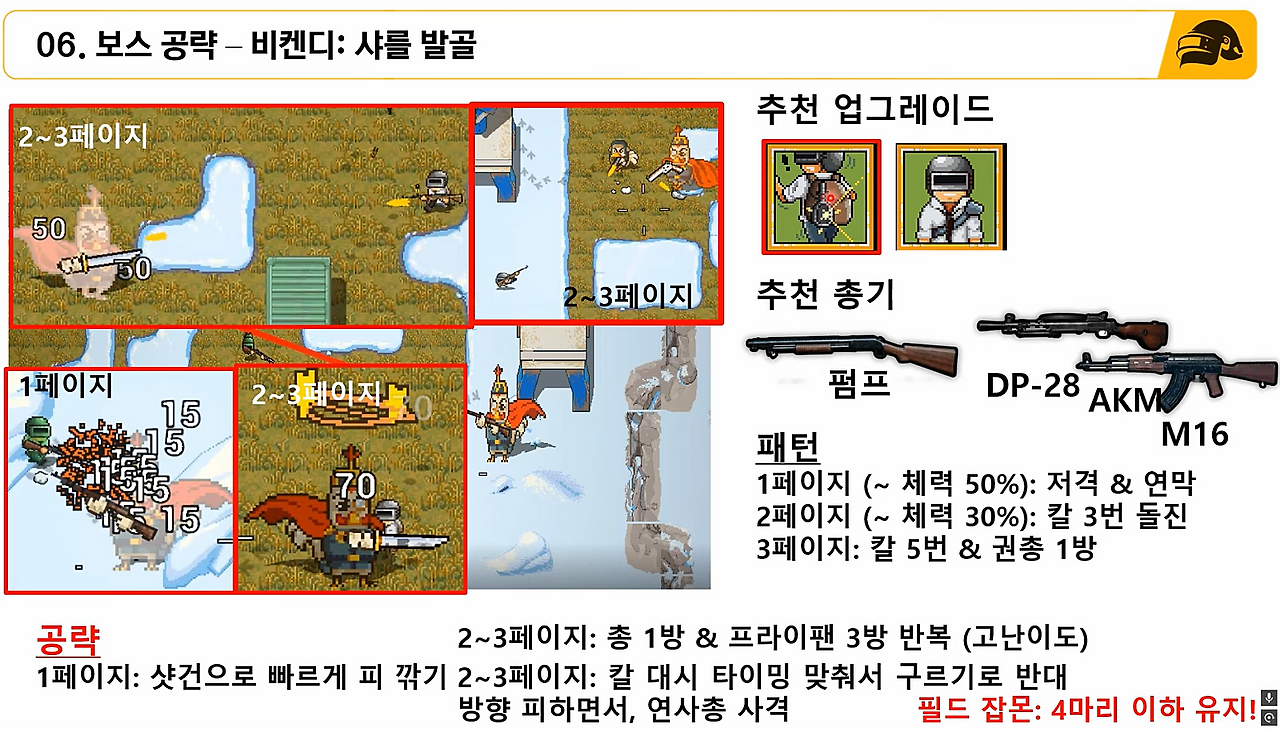 (2) (폽린이 공략) 갓라이팬이 있다면, 보스 체력 50% 될 때까지 연막에서만 싸우지 말고 근처에서 피 깎기. 2~3 페이지 때는 보스가 돌진하는 반대 방향으로 구르기를 사용하며, DP-28이나 AKM 등 연사총으로 잡기.