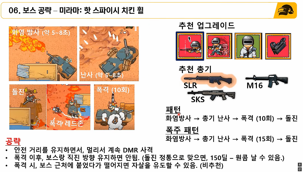 - 미라마/파라모에서는 DMR/SR이 큰 위력을 발휘하며, 에란겔로 넘어가면 빠르게 SR/DMR을 손절하시고 AR/기관총으로 교체하시는 것을 추천드립니다. (SLR -> AUG/AKM -> 그로자 -> M249 -> MG3)