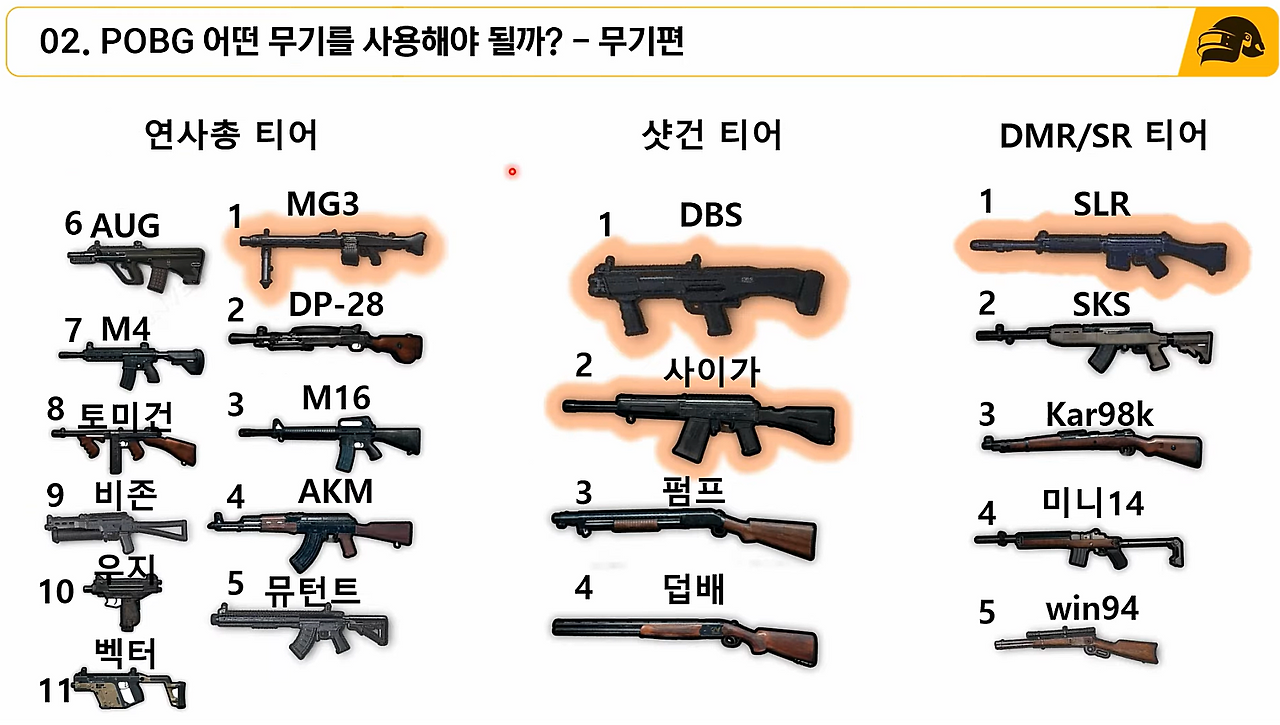 - AR/DMR은 "M16 -> AKM/DP-28/SKS -> SLR -> MG3"로 교체하시는 것을 추천드립니다.