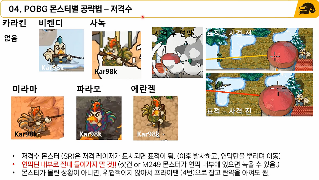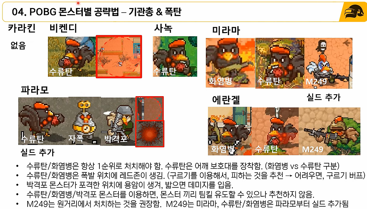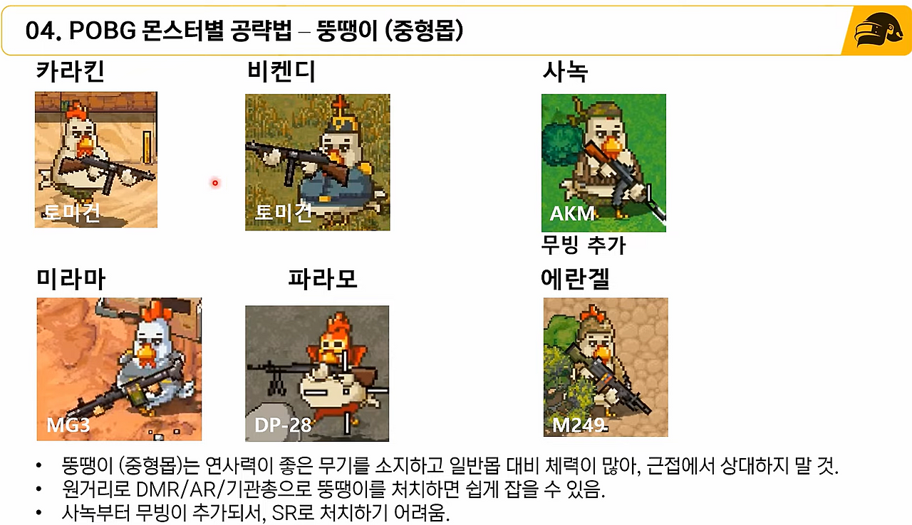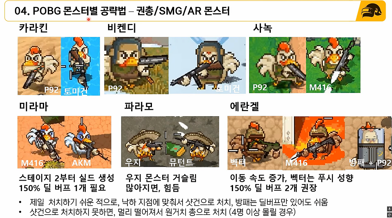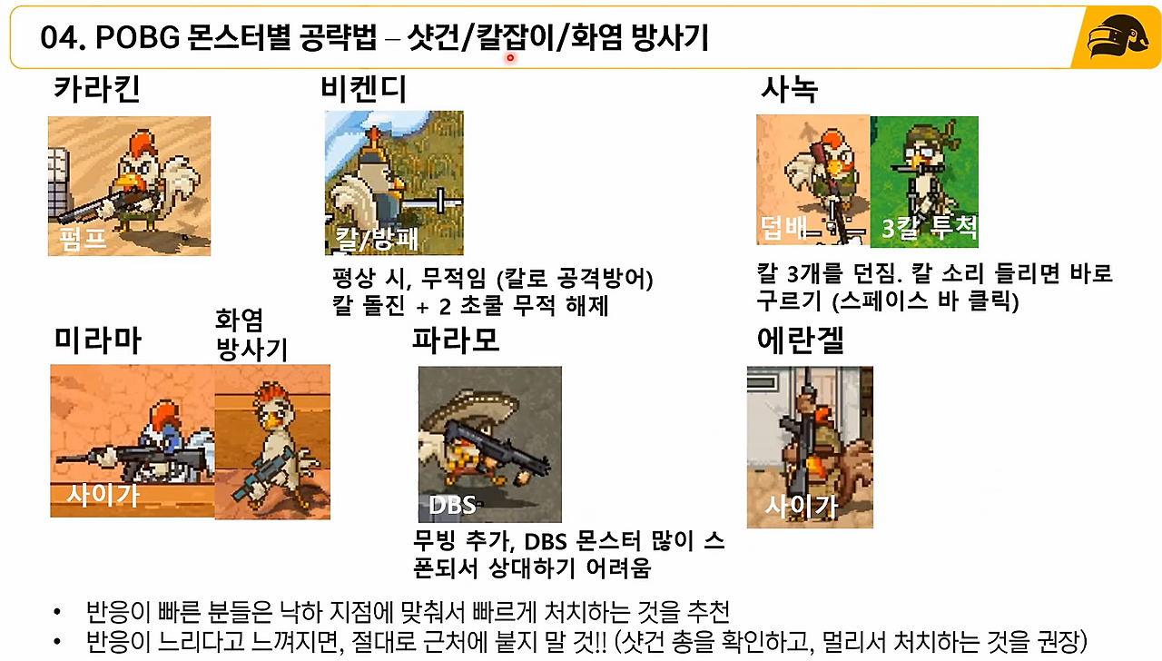- POBG 몇 판 플레이 하시면서, 내가 어떤 몬스터에 약한지! 파악하셔야 합니다.