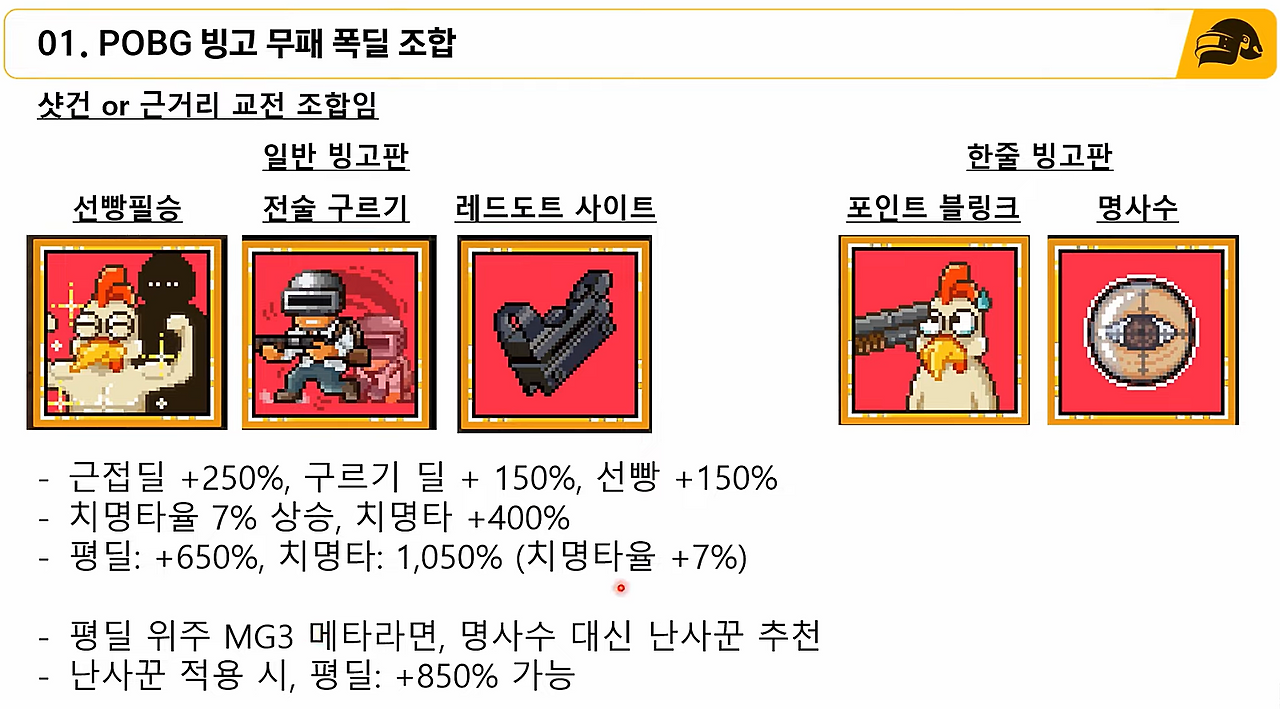- 추천 빙고 스킬: 전술 구르기, 갓라이팬, 레드 도트사이트