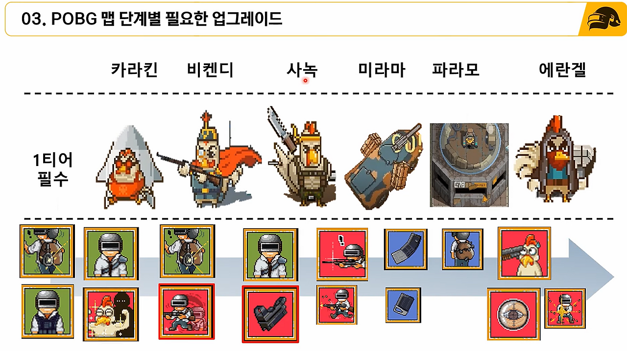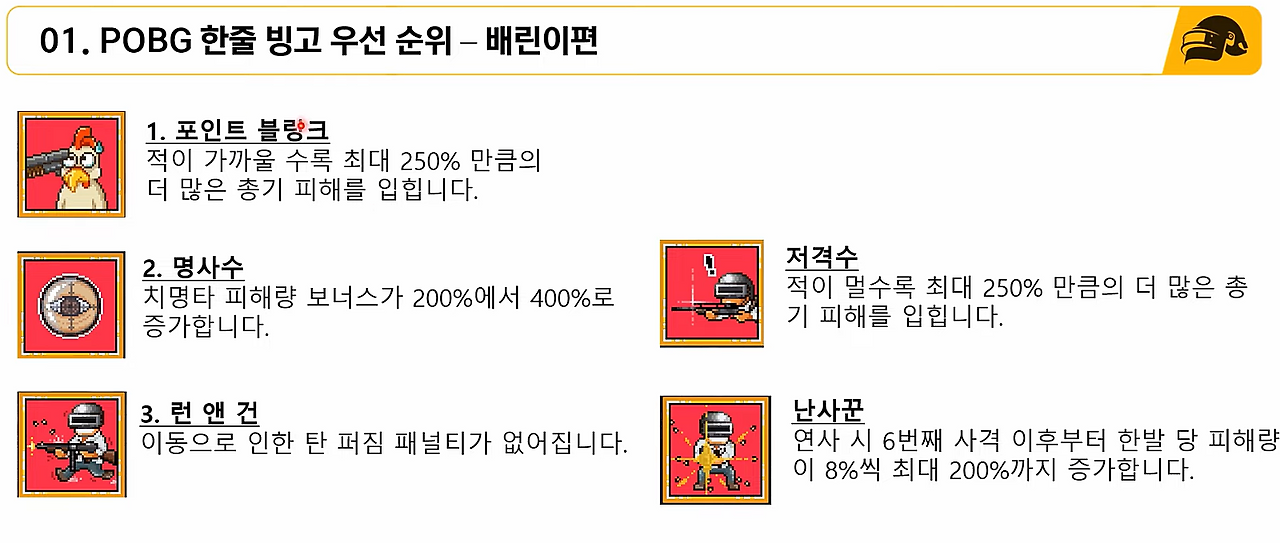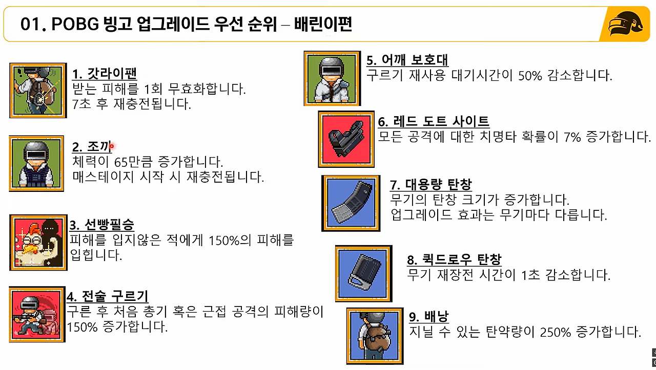 - POBG 시작할 때, 2번째 관문이죠...ㅎㅎ 대체 어떤 스킬을 먼저 골라야할지 고민이 될겁니다.