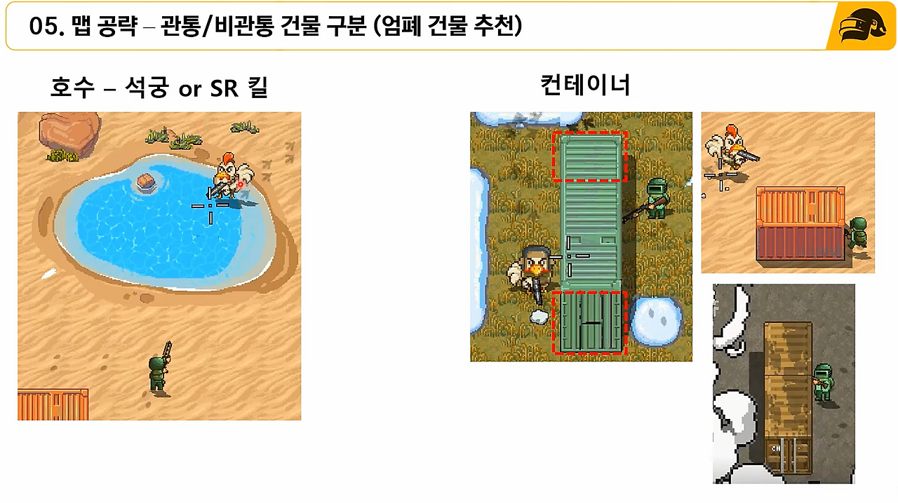 - 엄폐물은 ㄱ자 벽이 제일 좋으며, 그 다음으로는 컨테이너가 좋습니다.